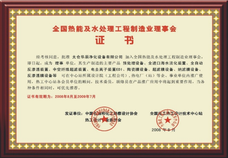 全國(guó)熱能及水處理工程制造業(yè)理事會(huì)證書(shū)